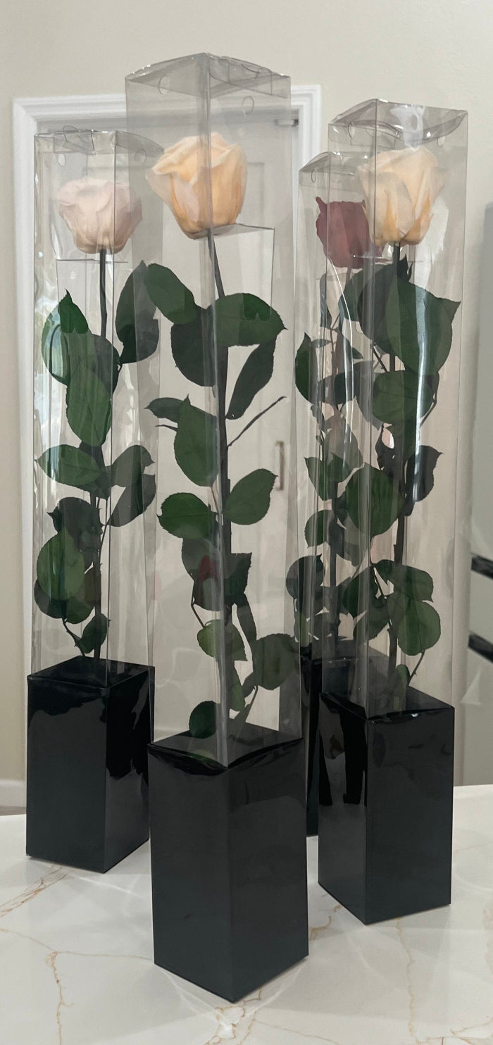 Our single long-stemmed (22 inches tall) preserved roses are the perfect everlasting gift for any occasion. Encased in a sleek clear PVC box, each rose is available in a variety of stunning colors, making it an unforgettable symbol of love and appreciation.
